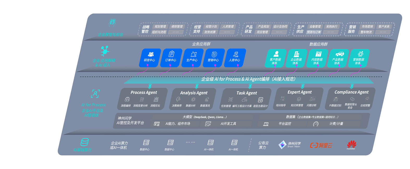 端到端的一站式AI工作空间深度融合了从企业战略规划到日常经营的全流程业务板块,,,定向解决车企内部领域多、、、、部门多、、链条长、、、、场景碎片化等难题,,支持车企快速构建以AI为核心的生产力写作体系,,,,实现任务执行与AI能力的无缝集成与交互